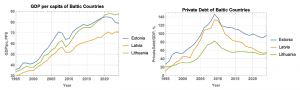2 pav. Baltijos valstybių palyginimas. Pirmoje dalyje lyginamas BVP/gyventojui PGP; antroje, privačių įmonių ir namų ūkių susikaupusi skola bankams.