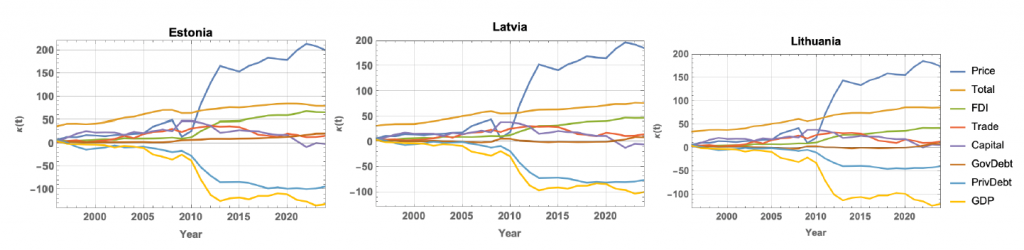 Antrame paveikslėlyje galime nesunkiai pastebėti, kad Lietuvos ekonominė lyderystė tarp Baltijos valstybių susiformavo po 2008 m ekonominės krizės, nes laikotarpyje iki jos ji sukaupė mažiausią privatų įsiskolinimą bankams. Tai nėra atsitiktinis sutapimas, nes mūsų analizė faktą patvirtina bendrame SRE valstybių analizės kontekste. Tam naudojame BVP pokyčio tiesinę regresiją su laike kintančiais koeficientais pasiektų kainų lygio, Tiesioginių užsienio investicijų (TUI), užsienio prekybos, vidaus kapitalo investicijų, valstybės skolos, privačios skolos ir BVP lygio atžvilgiu. Šios komponentės formuoja BVP pokyčius visoms valstybėms labai panašiu būdu, skiriasi tik kiekybinė tų pokyčių išraiška. Kaip komponentės suformuoja bendrą rezultatą Baltijos valstybėms demonstruojame 3 pav.