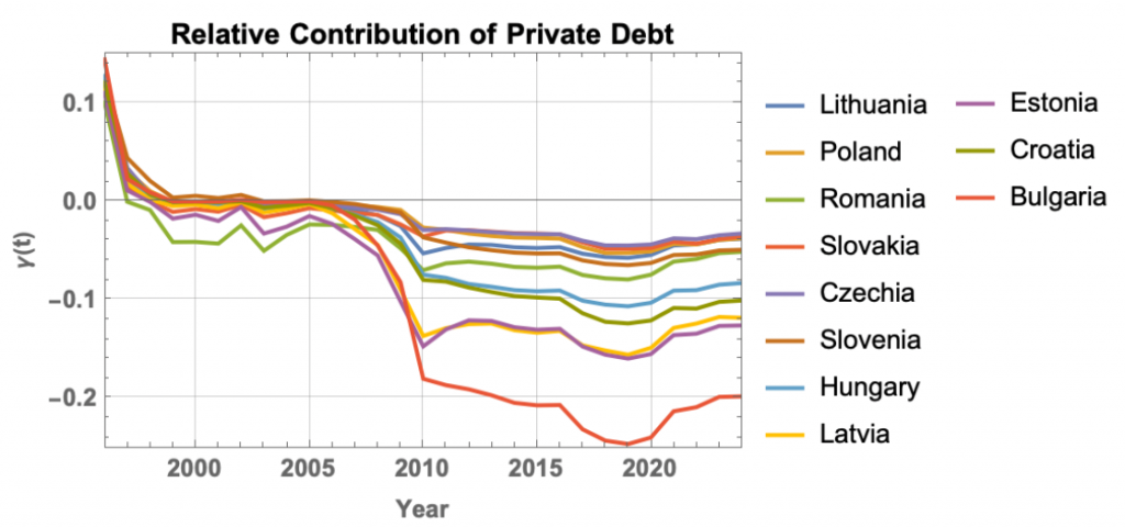 Iliustracija aiškiai demonstruoja, kad CRE valstybių ekonominis augimas po 2008 m. krizės žymia dalimi yra nulemtas sukauptos privačios skolos. Tai tikrai prisideda prie makroekonominio Lietuvos sėkmės aiškinimo ir gali būti panaudota tolimesnei ekonominio augimo teorijų plėtrai.