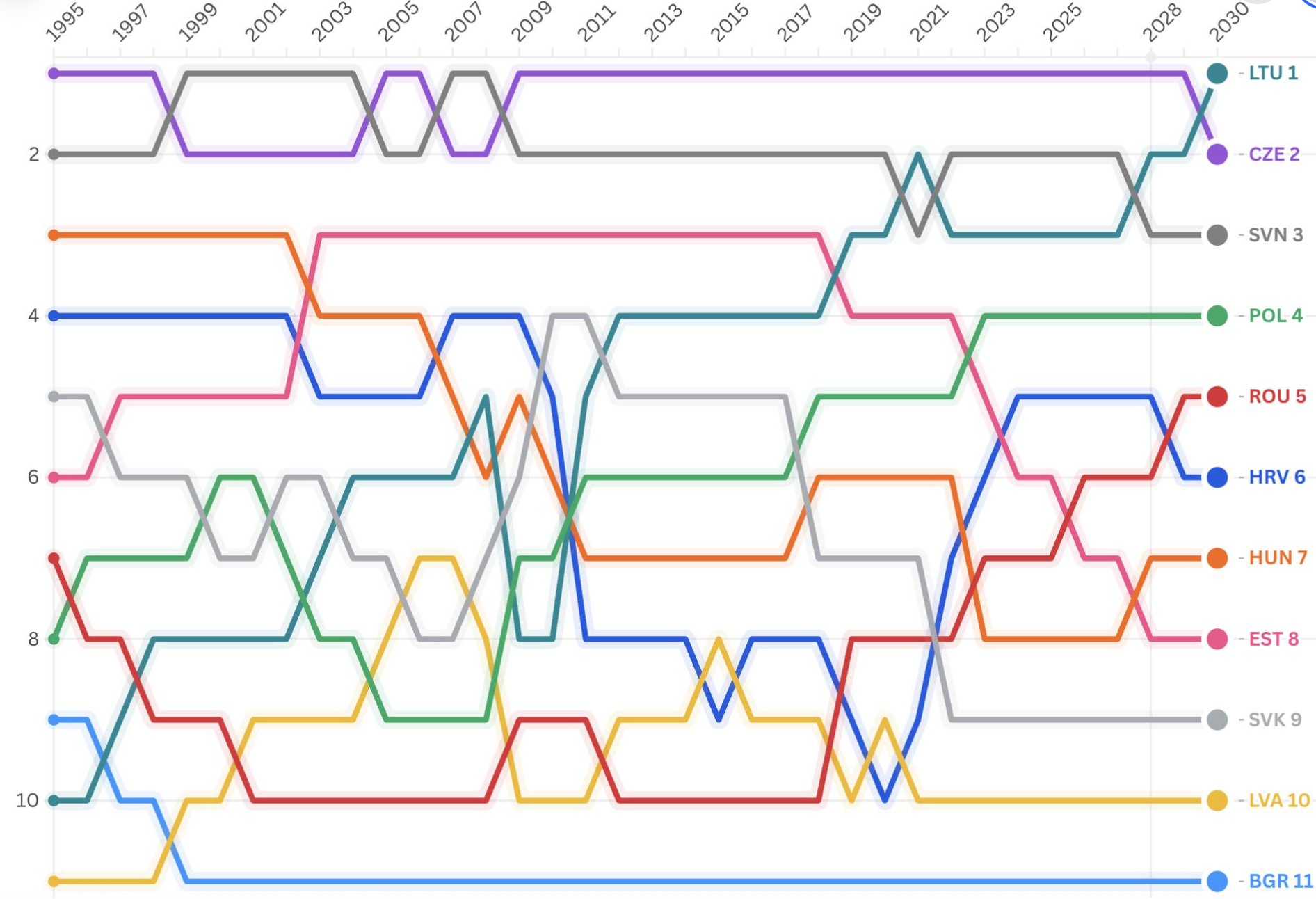 Prognozė tikrai nėra laužta iš piršto, nes ir pagal 2024 m. pasiektą BVP lygį Lietuva tik neženkliai atsilieka nuo Čekijos ir Slovėnijos. Lyginimas su Latvija ir Estija taip pat yra svarbus, kadangi visos trys Baltijos valstybės savo raidos kelią pradėjo nuo labai panašių istorinių politinių bei ekonominių sąlygų.